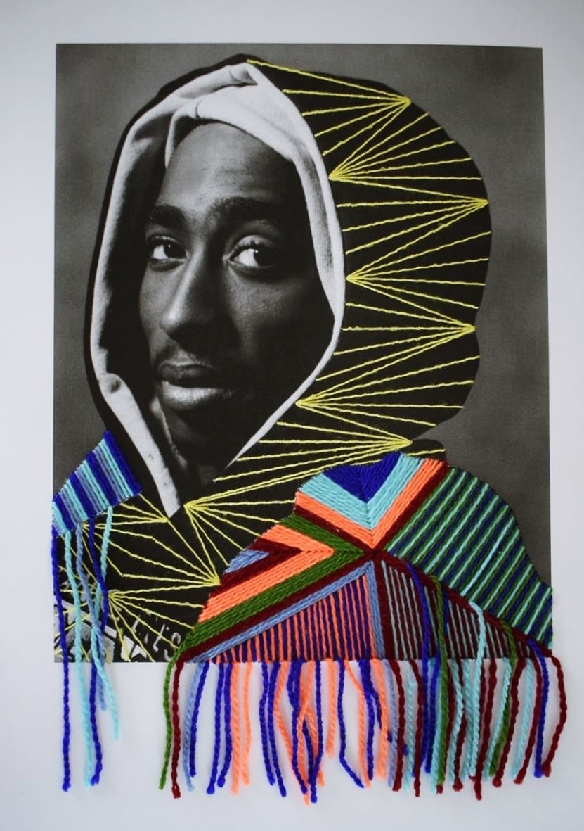 Tupac portrait in lamina paper 18.5 x 13 inches (47 x 33 cm) with textile handmade patterns.