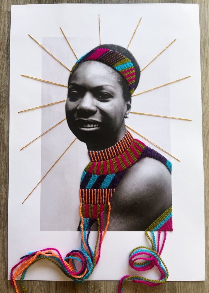 Nina Simone in lamina paper 18.5 x 13 inches (47 x 33 cm) with textile handmade patterns.